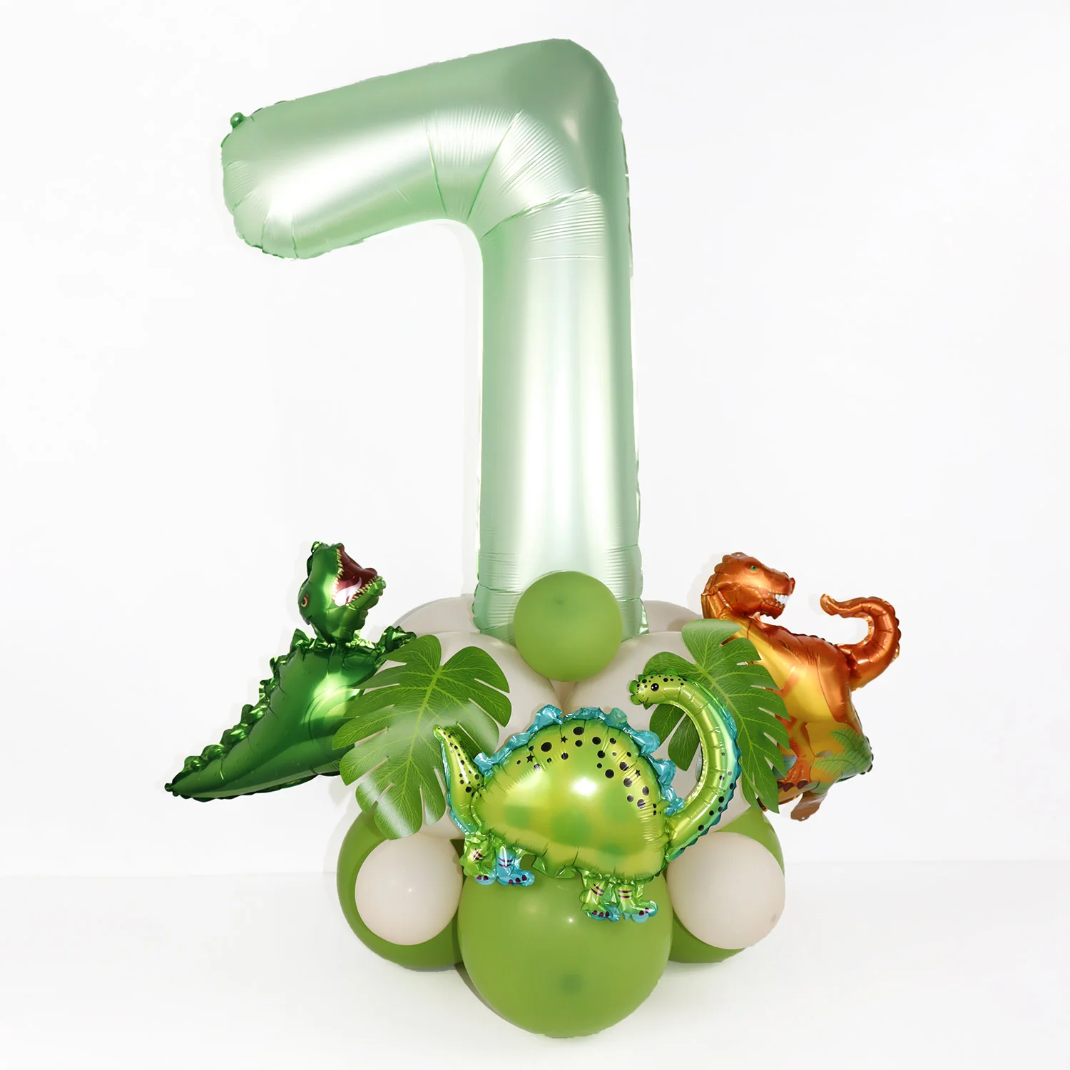 Package:21pcs Dinosaur Birthday Balloons Set (1pcs 32inch number balloon+3pcs mini dinosaur ballaoons+8pcs 10inch latex balloons+4pcs 5inch Latex balloons+2pcs mini long balloons+2pcs leaf+1pcs glue)
