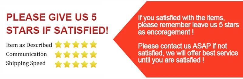 1. Please leave 5 star feedback if you're satisfied with our products and service, we will appreciate it (Item as Described 5 stars, Communication 5 stars, Shipping time 5-stars).